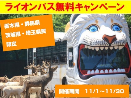 11月は ご来園いただいた栃木県・群馬県・茨城県・埼玉県民のお客様に対して、 ライオンバス(通常 大人 1200 円、子ども 6...